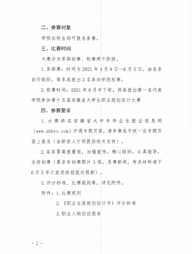 为深入学习习近平新时代中国特色社会主义思想和党的十九大及十九届二中、三中、四中、五中全会精神,认真贯彻《教育部关于做好2021届全国普通高校毕业生就业创业工作的通知》(教学 (2020) 5号),进一步提高大学生的职业规划意识,培养大学生的社会责任感和创新精神,引导大学生树立正确的成才观、就业观,学院将组织举办大学生职业规划大赛,现将有关事项通知如下: